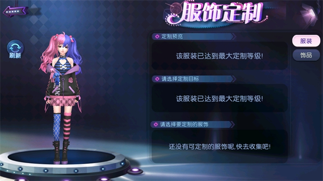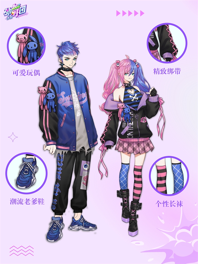 本期上新的活动服饰为疯狂街头,服饰整体配色炫酷活力、动感亮眼,嘻哈潮流味十足!女款疯狂街头为爱心镂空的黑白条纹内搭,搭配黑色可爱设计感外套,外套上缀有粉色玫瑰以及紫白色英文设计,胸前装饰有蓝粉娃娃,双袖上为粉色绑带设计。酷飒甜辣的装扮配上粉色格子百褶裙以及个性十足的潮流长袜,妥妥的性感辣妹!