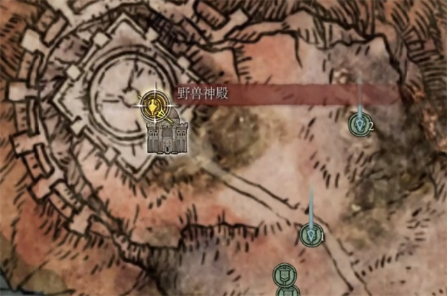 1、恶兵钩剑这个武器的位置在【野兽神殿】的外面,蓝色标注点1的位置就是;