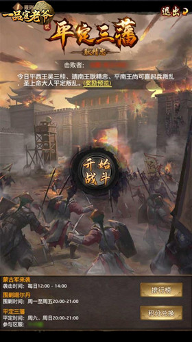 三藩叛乱,时局动荡,叛乱藩王不断出现,大人若能参与平定三藩,就可早日解救百姓于水火,大人们也可通过每次进攻以及击杀从而获得相应的奇珍或奇珍碎片。战乱不停,百姓名不聊生,还望大人与战友勠力同心,百战告捷!