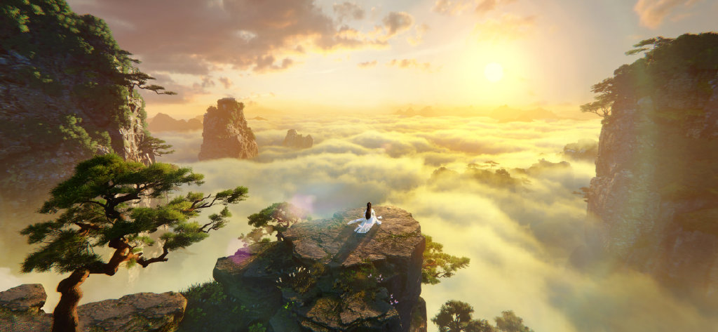 幽静深邃的竹林晨雨、万物皆有灵的大美开放世界、细到瞳孔都能反射周遭景色的光线追踪、美到不像话的体积云汹涌云海、每一缕青丝都在夕阳下熠熠生辉的灵动秀发、如真实世界绽放着绚丽火彩的宝石……
