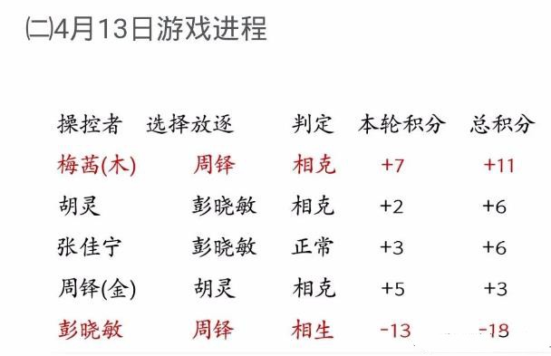 ①红色部分为已知线索可在剧本中找到。②根据4月14日全员无绿灯、梅茜张佳宁黄灯可知, 4月13日三种判定方式均出现且梅茜与张佳宁未被放逐。③彭晓敏判定为相生按理说应当-5分却被扣了13分,可推理出她4月13日被2人放逐且一个判定相克、- -个判定正常。因为彭晓敏放逐周铎的判定为相生,根据规律可知“你判定我为相生, 我判定你亦为相生”,放逐彭晓敏的玩家为胡灵与张佳宁,由4月12日表格推理可知,胡灵判定彭晓敏的结果为相克,张佳宁判定彭晓敏的结果为正常。④推理到这只有周铎选择放逐未填,根据亮黄灯的条件可判断4月13日周铎选择放逐胡灵。⑤根据4月14日你与周铎的问答可知,周铎的判定结果为相克。⑥选择放逐与判定填满后,积分可根据游戏规则计算出来。已知周铎隐藏身份为“金”,周铎与胡灵相克,故胡灵隐藏身份为“火”,同理可证,彭晓敏隐藏身份为“水”,根据排除法可知,张佳宁隐藏身份为“土”。根据转换卡线索可知, 4月14日晚八点前梅茜将胡灵与彭晓敏的隐藏身份互换,故胡灵隐藏身份为“水”,彭晓敏隐藏身份为“火”。