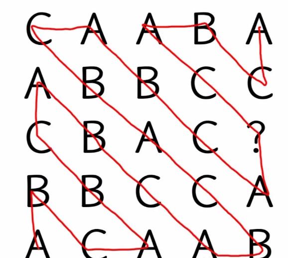 问.上图第999个图案为黑色还是白色?请做出你的选择。解答:该题目以8个图案为一个循环,因此用999除以8得到124余7。可以理解为124个整循环后再从头数第7个图案便是结果,即●,为黑色。第一案:数字找规律题目:2,3,135,7,74X, 8, 80求X解答:22+32= 4+9= 1352+72= 25+49= 74?2+82= ?2+64= 80故?=4得到线索:你使用窥视卡查看周铎的隐藏身份,他的隐藏身份为“金”。第二案:问号填字母题目:如图所示,已将A,B,C填入25个空格中,每格一个,请根据规律选出问号所代表的字母。(提示:蛇)