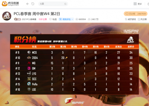 北京时间2021年5月5日18时,虎牙绝地求生PCL春季赛常规赛周中赛第四周Day2继续开战,KX领衔维寒迪赛区坐镇主场迎战艾伦格群雄。转战维寒迪的大将军ZpYan1继续上演自由人惊艳表现,本轮携手MMing率领NH打出恐怖正面火力制霸淘汰榜,最终NH拿下59分以四分之差力压17登顶积分榜。另一边两位4AM旧将龙宗泉与5V率领Tiger与JTeam各自打出不俗发挥,凭借本轮高光表现两支战队继续保留周决希望。