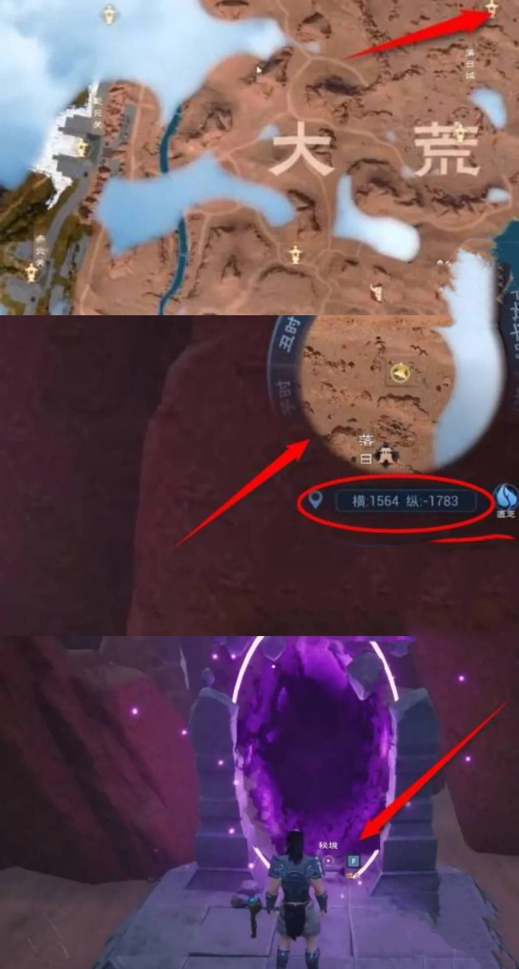 2.可以去秘境,很大机会买到。秘境的地点在打开太荒初境,来到大荒,找到落日城右上方的地点,传送过来后,根据下图中坐标的具体地点进行寻找。到达该坐标后,靠近秘境,点击进入即可。