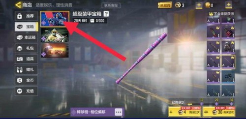 1. 左边这栏第二个“宝箱”,找到第一个“超级装甲宝箱”里面,可以抽取到“相位偏移-棒球棍”