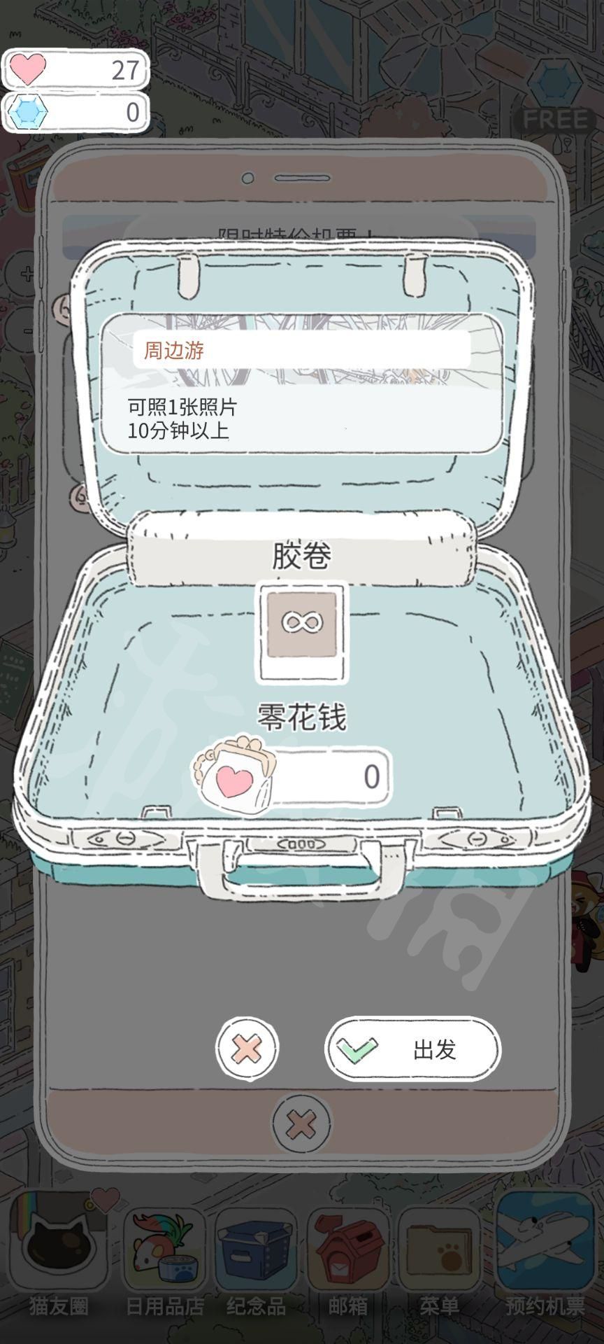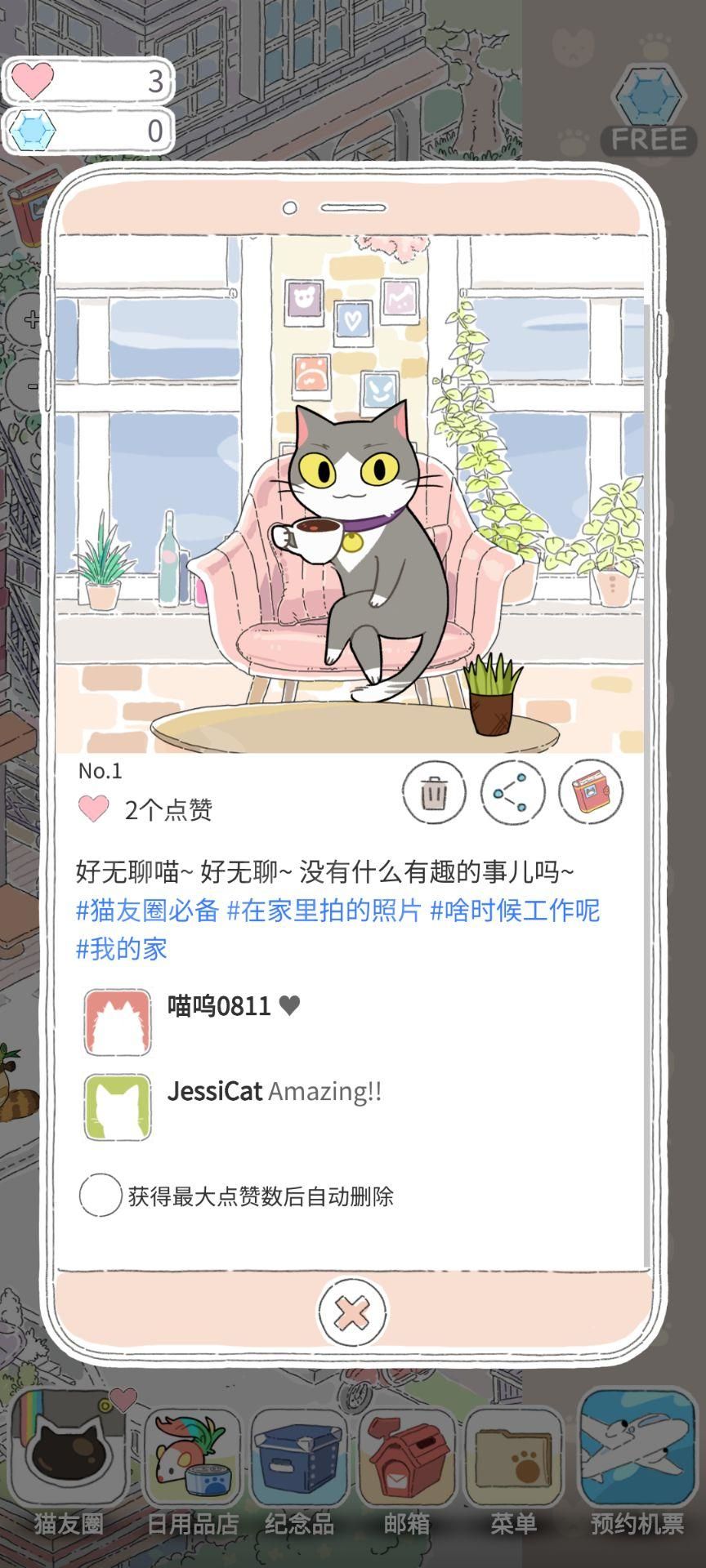 发布照片,猫猫会在猫友圈中获得点赞,收集到的点赞可以作为心情收集起来,收集到了一定心情就可以让猫猫去旅行。