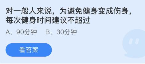 蚂蚁庄园5月25日给大家带来了问题:【对一般人来说,为避免健身变成伤身,每次健身时间建议不超过?】,健身时间长了并不是只有好处,接下来小编给这个问题带来了答案,感兴趣的小伙伴一起来了解一下吧。