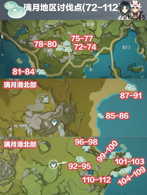 石门、璃月港北部等地区,总共有40只史莱姆。各点位如下图。