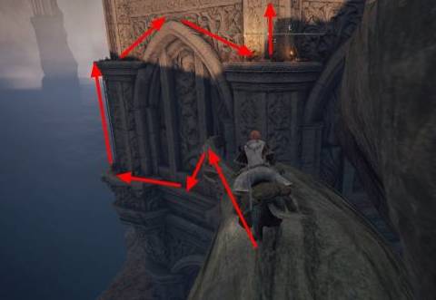 1.我们来到盖利德神授塔底部,在通过旁边的树干到达神授塔的边上,然后沿下图所示线路向上走。只要在墙壁边缘直接往左走就行。