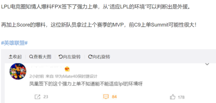 还值得一提的就是我们FPX战队,大家都知道FPX自从冠军队友相继离开之后一直都在进行补强,甚至不惜重金签下了Clid选手,虽然这个赛季还是止步了季后赛,但是FPX这个转会期都在努力寻找新的上单选手。根据知情人士的爆料已经在沟通一个强力的上单外援。同时韩媒相继发声:曾经为LCS豪门C9效力的Summit选手正在与LPL劲旅FPX接触,处于沟通阶段。对此Summit经纪人回应道:和某支战队的沟通即将完成,暂时不能公开目标战队,结果以官宣为准。