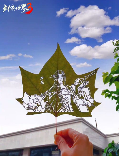 叶雕,也称剪叶,是一种古老的民间艺术。其制作工序极其复杂,需经过60多道工序,结合绘画、微刻、书法等多种工艺,在纵横交错的叶脉纹理间,勾勒心中所想,可谓是“纳须弥于芥子,藏日月于壶中”,借助雕刻,赋予落叶永恒的美学价值。而本次非遗联动,叶雕匠人以万花女侠形象为雕刻灵感,一双巧手,使风雅万花再现于飘零落叶之上。笔墨生花,灵动自由,飘逸的发丝与腰间的花纹,每一道刻痕都如同万花笔法一般行云流水,可谓是匠心独运。