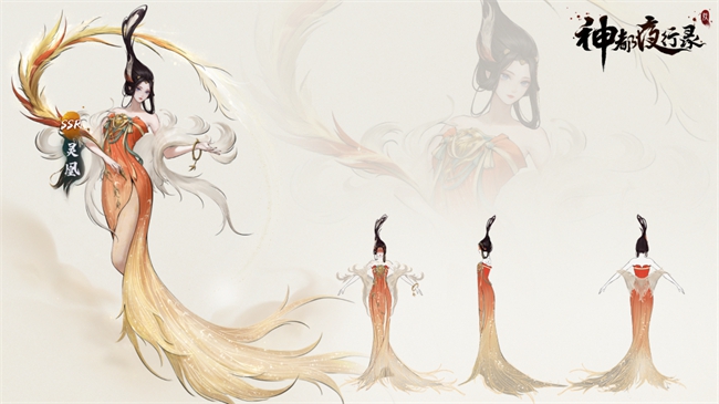 灵凰身量婀娜高挑,由凰羽幻化而来的抹胸长裙上,金色灵凰图案格外显眼,裙摆上满是金纹与鸟纹,半透明的金色薄纱不断延展,构筑起华丽和圣洁的画面;黑色长发信手束起,偶尔垂落的几缕青丝流露出少女的活泼与俏皮,冲天发髻上别着精致的金饰和两根翎羽,右手轻握一支巨大的凰羽,神态优雅而充满韵律感。