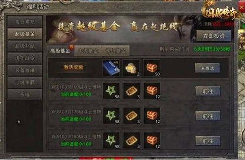 在开服第七天我们会开启超级基金活动,超级基金活动分为高、中、初三个档次。不同的档次对应的奖励材料数量分别不同。但都是用于提升自己的阵法等级。阵法等级可以给我们的面板属性带来可观的增幅。在我们激活资基金之后就可以积累材料提升阵法等级并获取对应的金矿及奖励。