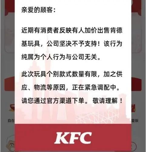 为此,肯德基也在24日通过其官方APP发布声明:“近期有消费者反映有人加价出售肯德基玩具,公司坚决不予支持!该行为纯属为个人行为与公司无关。此次玩具个别款式数量有限,加之供应、物流等原因,正在紧急调配中。请您通过官方渠道下单。敬请理解!”