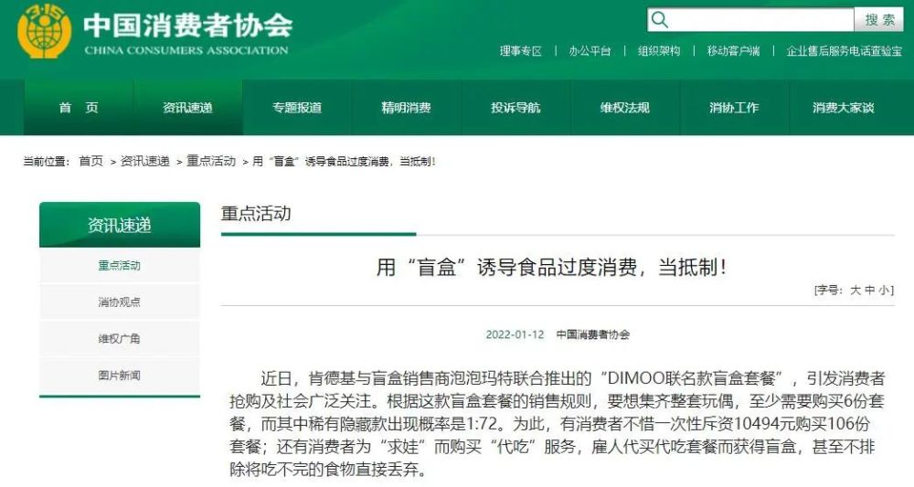 1月12日,中消协发布观点,点名了肯德基此前与泡泡玛特DIMOO展开的联名盲盒活动。中消协表示,该次联动中,要想集齐整套玩偶,至少需要购买6份套餐,而其中稀有隐藏款出现的概率是1:72。为此,有消费者不惜一次性斥资10494元购买106份套餐,还有消费者选择购买“代吃”服务,甚至不排除将吃不完的食物直接丢弃。