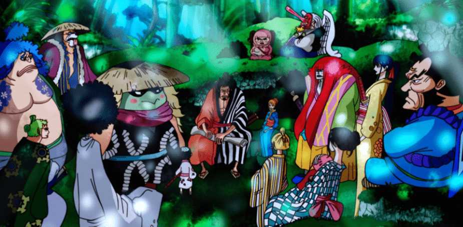 本话第一幕讲述的就是凯多与路飞战斗的结果,猫蝮蛇率先将路飞的获胜的消息通知了鬼岛全岛。随后路飞恢复到了正常的姿态,凯多则是掉入了和之国地下深处的熔岩当中, 巧合的是大妈竟然也在这。