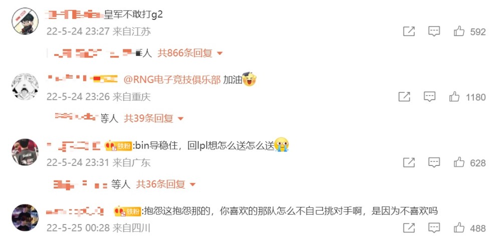 很多国外的尤其是LCK的观众直接开喷RNG战队太怂,不敢选G2作为对手,LPL这边也有观众给出类似的评论,而且还得到了不少的点赞,在评论下面有大量的观众对其进行了举报,因为这个人使用了不当的词汇来形容RNG战队。