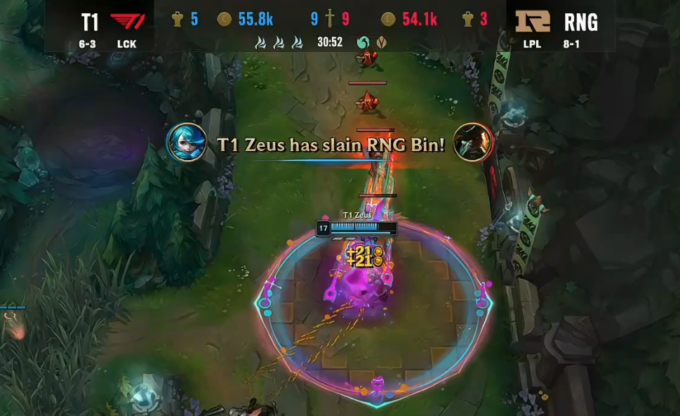 随后,RNG的中野不断起节奏,并一度打出了5-1的“人头”比。但可惜的是,因为上单选手Bin总是使用大招来对线,导致RNG无法很好地争夺关键的峡谷先锋,而两条峡谷先锋被T1拿到,成为了T1掌握前期节奏的关键。在使用峡谷先锋成功拔掉了RNG所有外塔之后,RNG的视野受到了压制,发育也受到了影响。虽然在经济上并没有明显的落后,但因为RNG是后期阵容,前中期并没有太大的作战能力,所以依旧拿T1没有什么办法。不过,正当许多人觉得RNG会慢慢将比赛拖下去的时候,Bin在下路单带的时候遭遇到了Zeus格温的“单杀”,也正是这波“单杀”,直接是让T1拿到了关键的大龙。而T1再凭借着自己强开团的体系,并没有给RNG任何喘息的机会,直接是一波带走了RNG。