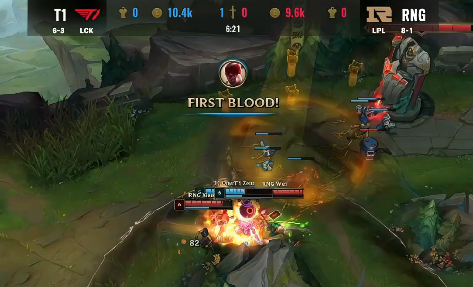 这场比赛一直到6分钟左右才爆发了第一人“人头”,是由T1这边拿下了Bin船长的“人头”,不过随后赶到的RNG中野也是成功收掉了Zeus格温的“人头”。但是在这波交手中,RNG其实是亏掉了一个闪现的。