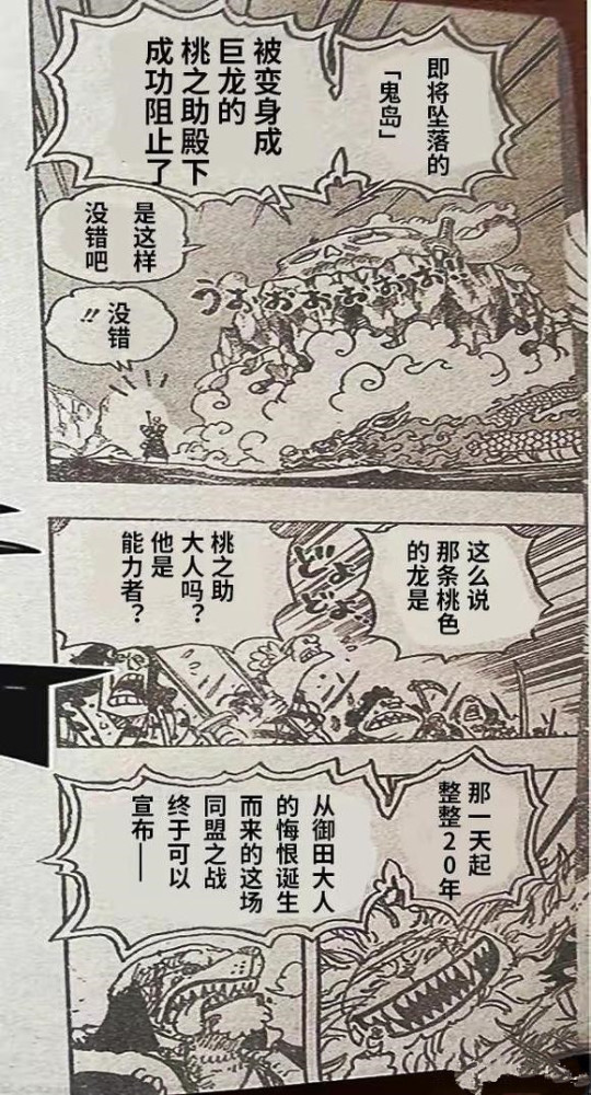 不过因为桃之助化身飞龙,被花之都的民众当成了凯多归来;不过被桃之助解释清楚了,之后桃之助更是化为人形,不过因为烟雾,并没有看到桃之助真正的模样。