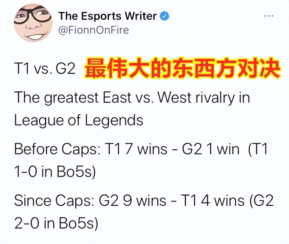 并且他还统计了历年来,T1和G2之间的交手战绩:Caps加入G2之前,T1在对阵G2的比赛中,取得了7胜1负的战绩,其中BO5战绩为T1 1-0领先于G2;在Caps加入G2之后,T1在对阵G2的比赛中,取得了4胜9负的战绩,其中BO5战绩为G2 2-0领先于T1。