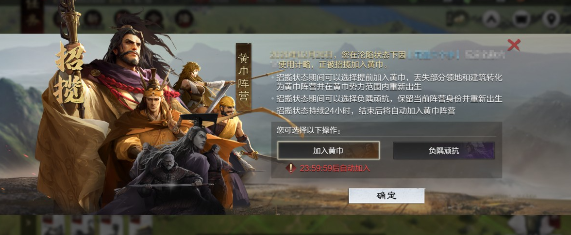不仅如此,在另一组阵营的设计上,游戏也十分支持玩家跟随本心选择“打不过就加入”。那些随黄巾军起义的玩家们虽然在游戏前期极少能得到来自阵营的支援,所拥有的地盘也少之又少,但他们却拥有一项重要特权,那就是在击败敌对玩家之后可以将对手强行“赚上梁山”,收编被击败的敌人。