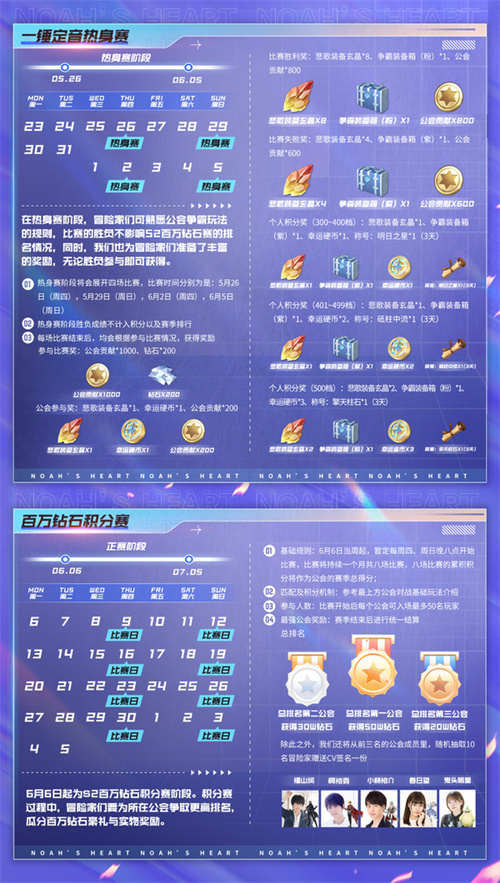 公会赛的第一赛季将分为热身赛和钻石积分赛两个阶段举行,5月26日到6月5日为热身赛阶段,6月6日到7月5日为钻石积分赛阶段。根据公会赛进行阶段的不同,奖励也有变化。