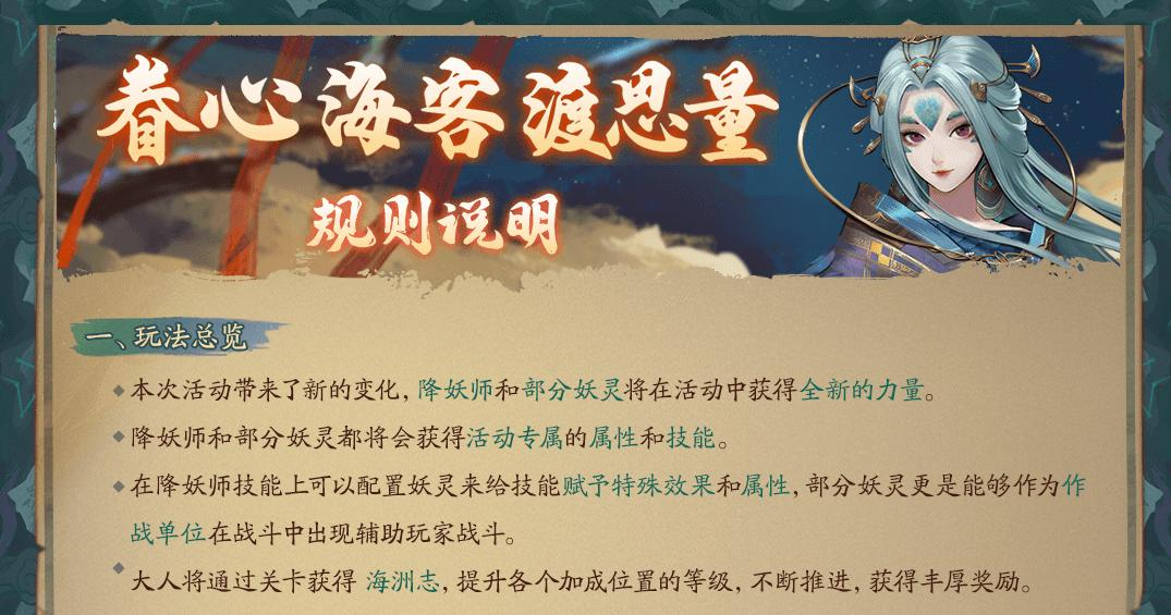 自思量岛破空而来,寻觅重返上界之法的奉眠将在全新活动“眷心海客渡思量”与你并肩作战,该活动为“吞象积骨踞巴陵”活动的升级版,在新增保存多套阵容、一键升级、一键配置等功能和更多候选妖灵的同时,也优化了攻击表现和美术效果,迭代了养成界面与操作体验,且未降妖师们准备了灵凰碎片、灵凰唤灵符、幽都神藏、混沌洪源等珍贵奖励!