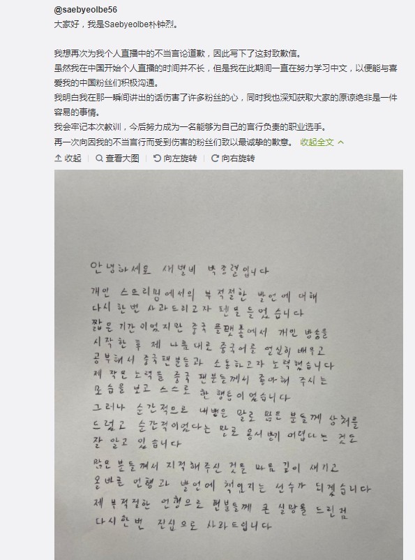 而后,Saebyeolbe对此前关于中国的不当言论道歉,表示今后要努力成为一名能够为自己言行负责的职业选手,并附上了手写道歉信。