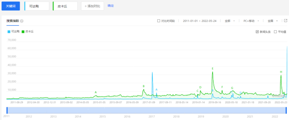 伯虎财经通过百度指数发现,可达鸭的爆红来得十分突然却不含糊。5月23日左右,可达鸭的百度指数猛涨至64359,同期的皮卡丘仅有6932,前者的讨论热度是后者的10倍左右。