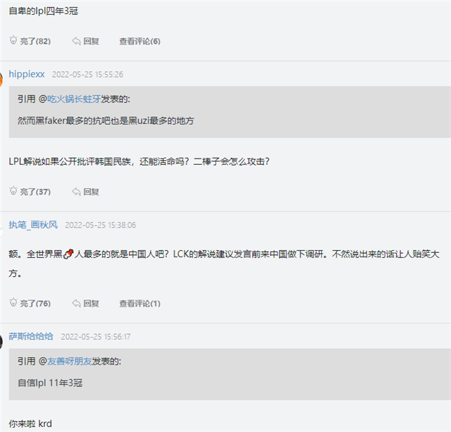 Bitdol是LCK赛区铁粉,得知“大魔王”李相赫被指责,Bitdol忍不住了。他认为LPL观众只是自卑、心理不平衡。看不得三冠王在其他赛区。这位解说甚至用乌兹举例,吐槽他是“失败者”,同时开团赛区粉和乌兹粉。