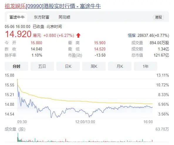 在此之前,腾讯共持有祖龙娱乐105,077,999股,占总股本比例12.88%。4月29日,腾讯在场外以每股13.96港元增持2446.5万股,耗资3.42亿港元,持股增至15.88%;次日,腾讯再耗资1.14亿港元增持815.51万股,占总股本比例升至16.88%。受该事件影响,截至6日收盘,祖龙娱乐股价上涨6.27%,股价为14.920港元,市值达121.67亿港元。