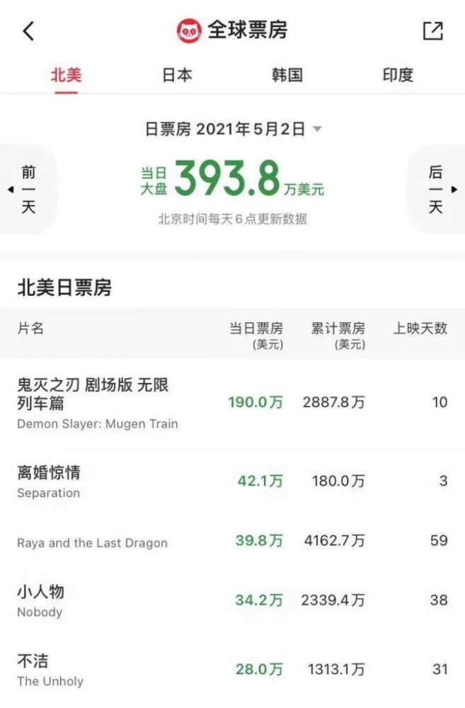 目前猫眼专业版数据显示,截至5月2日《鬼灭之刃》电影累计票房达2887.8万美元;而据时光网5月5日报道,《鬼灭之刃》北美累计票房已达3410 万美元,成为北美影史票房第三高的日本动画电影,仅次于华纳1999 年和 2000 年发行的两部宝可梦电影,后者累计票房分别为8574万美元和4375万美元。