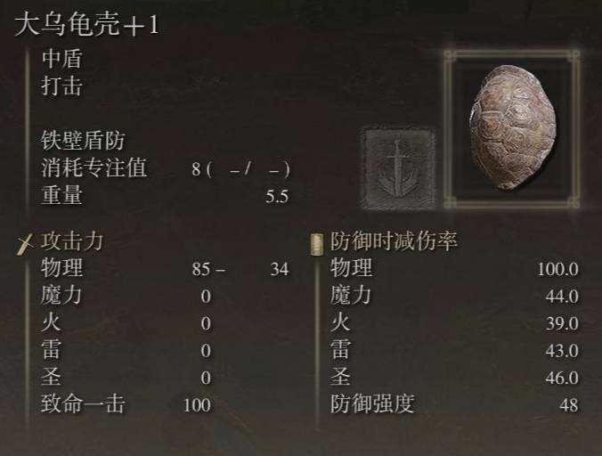 5.失乡骑士盾。获取技巧史东薇尔城内士兵掉落。优点高防强。缺点比龟壳略重,难刷。