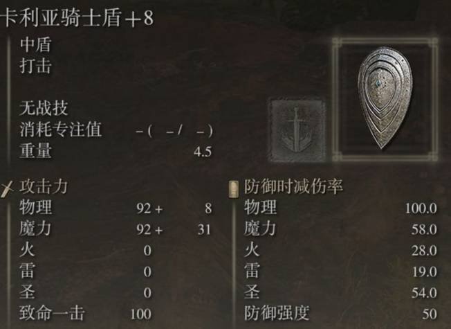 2.卡利亚骑士盾。获取技巧学院满月女王前红魂掉落。优点高魔力、圣减伤,重量较轻,好看。缺点火、雷击减伤低。