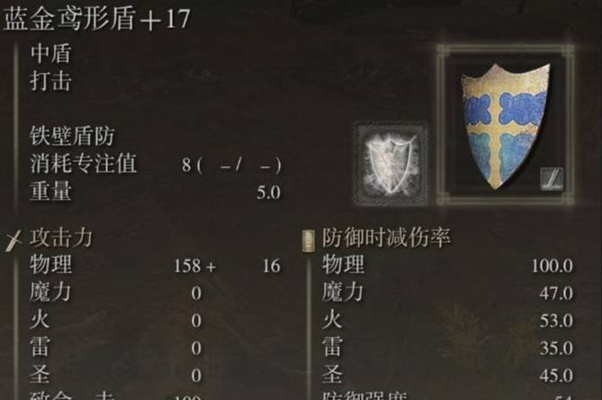 3.蓝金盾。获取技巧海德要塞西部赐福向北商人,如图绿标记处。优点12力匹配名刀月隐,减伤分布较平均。