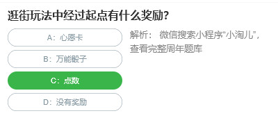 淘宝人生“桃仁300”的问答活动中每天都会有10道题目,只要答对一道题目就可以得到兑换券,“逛街玩法中经过起点有什么奖励?”,大家知道这个题目的答案是什么吗?下面就和小编一起来看看这个活动的题目答案吧。