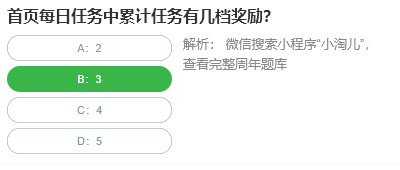 在淘宝人生3周年桃仁300活动中,有很多的题目,不过每天需要答题的只有十道哦,“首页每日任务中累计任务有几档奖励?”,大家知道这个题目的答案是什么吗?下面就和小编一起来看看这个活动的题目答案吧。