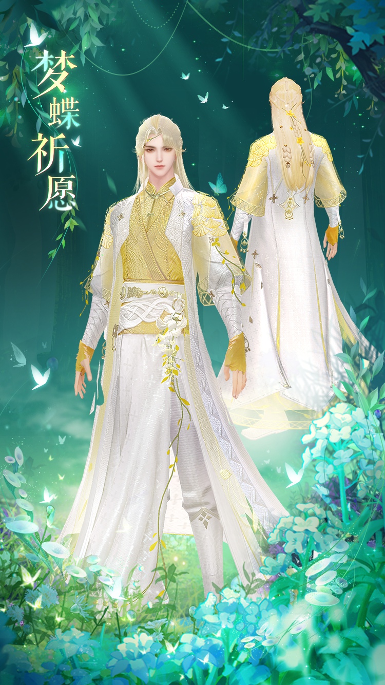 男版【碧山秋暮】以澄黄与雅白为主调,淡金色长发披于脑后,额前的刘海被藤蔓轻柔地挽起,露出少侠坚毅的目光。烫金与暗银丝线在每一层衣衫上绣出了繁复花纹,低调之余而不失别致。腰间垂下的繁花几朵,与肩臂上层叠的金丝枫叶遥相呼应,给人儒雅亲切之感。
