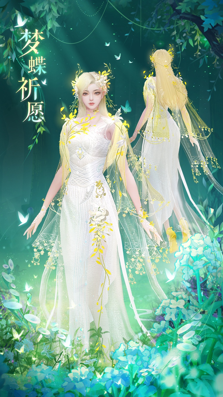 女版【碧山秋暮】衣裙通体洁白,缀上明黄为辅色吸睛,百花编织成冠,在她发边肆意绽放。腰间以交叉式设计,勾勒出盈盈一握的纤细腰肢,藕臂于鹅黄色的披肩下若隐若现。腰间垂下繁花一束,随着少女的步伐轻轻摇曳,传来沁人心脾的自然清香。
