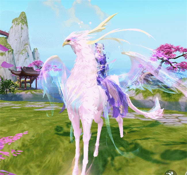 坐骑【香白芷】全身粉红,羽翼末端呈现青蓝色,如同绿叶烘托中的花苞,粉艳浪漫。四肢如马蹄般强壮,健步如飞,千里一瞬。