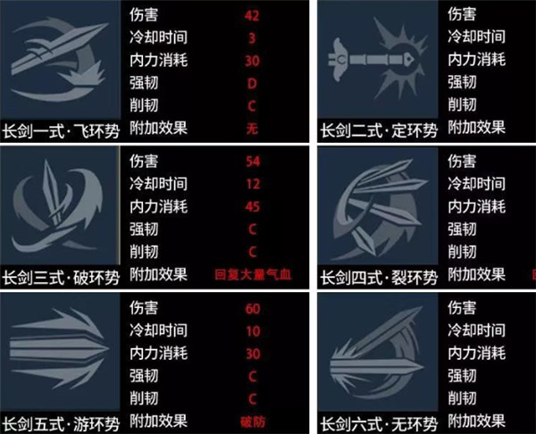 2、长剑的优点就是招式筹齐容易,且先手技能多,招式伤害中上。
