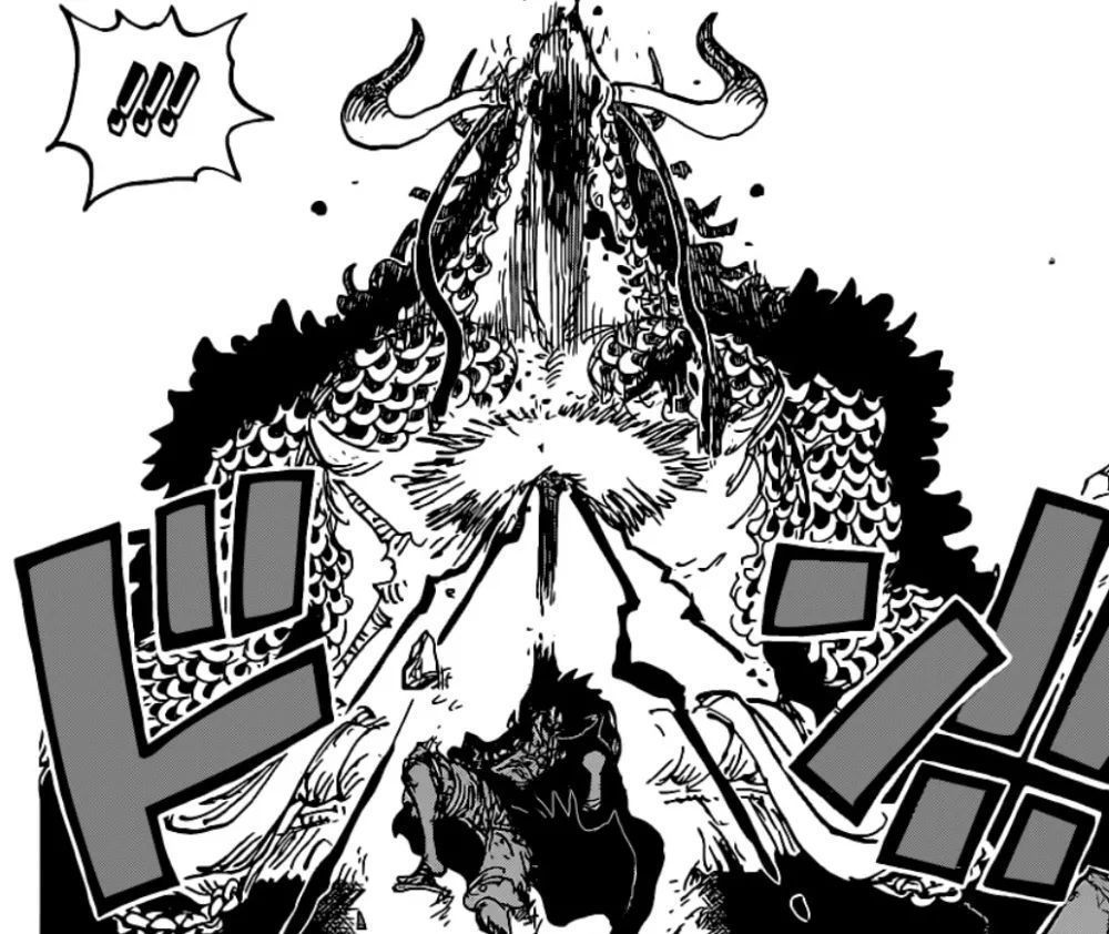 在路飞与凯多的最终决战中,路飞被凯多一招引奈落失去意识,醒来后领悟了霸王色霸气缠绕。就在两人即将分出胜负的时候,CP0成员突然偷袭路飞。路飞来不及迎击凯多的咆雷八卦而重创又失去了意识。