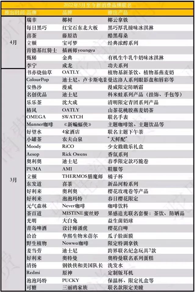 正因为IP联名优势明显,近年来,IP联名已经成为了各大品牌惯用的营销手段。据不完全统计,仅仅在22年3月,就有30多个品牌进行联名营销,其中IP联名占多数,诸如泡泡玛特和好利来的春日樱花限定联名、安热沙与漫威联名推出的漫威限定防晒霜。