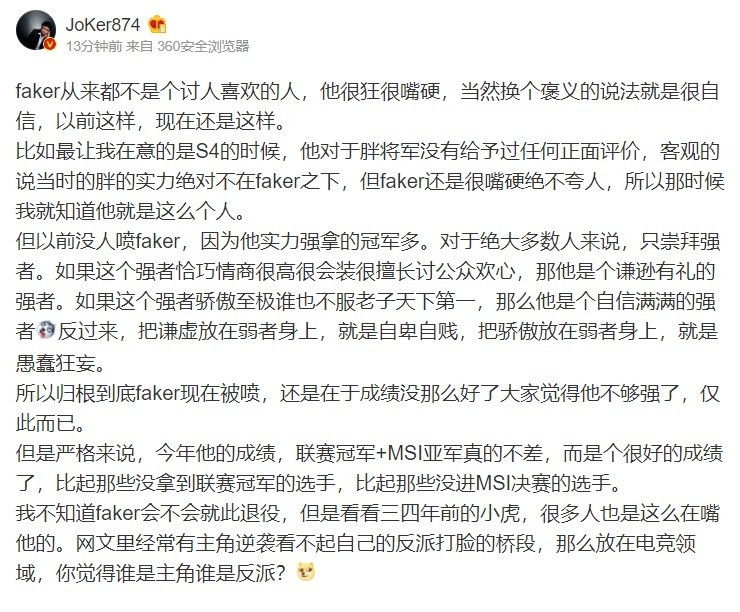 faker从来都不是个讨人喜欢的人,他很狂很嘴硬,当然换个褒义的说法就是很自信,以前这样,现在还是这样。