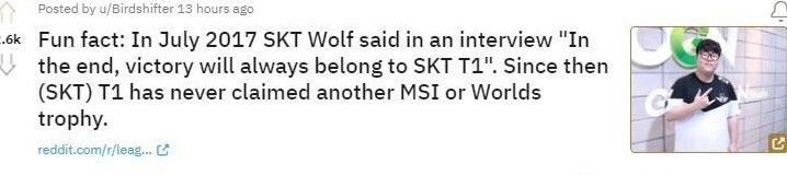 而Reddit网友分析了一则令T1尴尬的数据,其表示在2017年7月SKT Wolf接受采访时说“最终胜利永远属于SKT T1”后