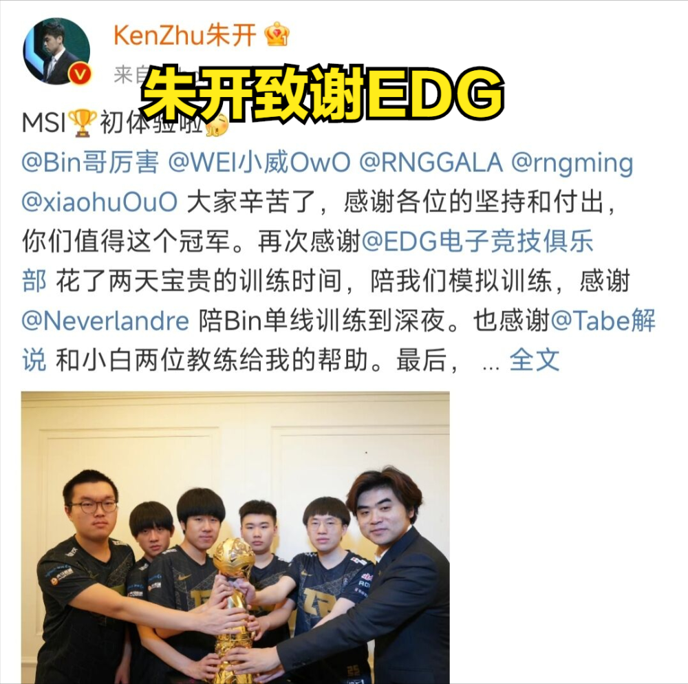 在2022釜山MSI决赛中,RNG鏖战五局成功击败强大的T1,不仅如愿蝉联MSI季中赛冠军,更是成为了全球各个赛区首支三夺MSI冠军的队伍,RNG的主教练朱开更是仅用269天就达成了大满贯成就。在夺冠后的第一时间,相信很多人也都看到了,朱开教练就公开发文感谢了EDG的全体成员的陪练和帮助。但其实许多人不知道的是,朱开教练在决赛首局还未结束时,就曾致电EDG来虚心求教。