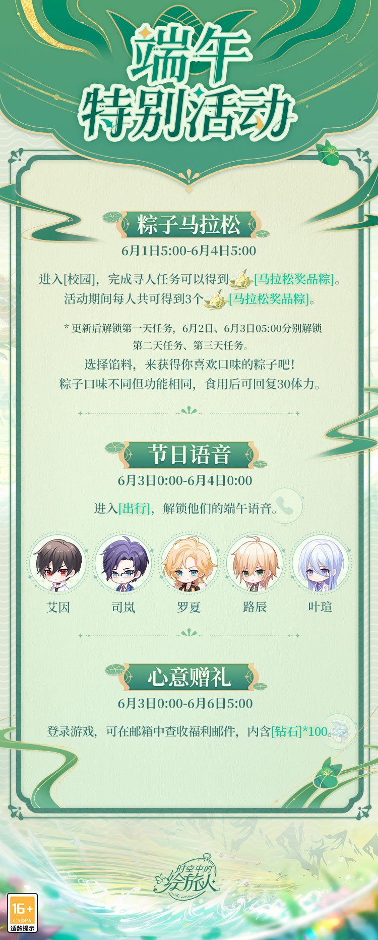 ►出行语音:6月3日00:00-6月4日00:00,在【出行】界面解锁他们的端午问候。