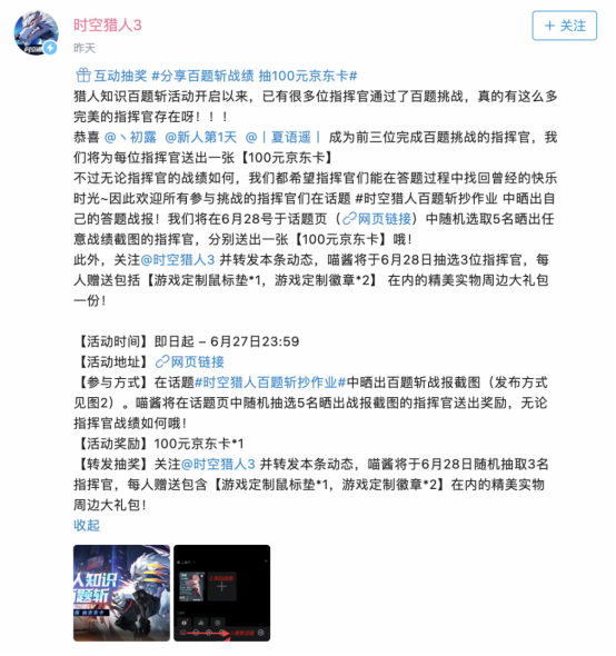 参与抽奖的方式也特别简单,只要在游戏官方B站账号话题 #时空猎人百题斩抄作业 中晒出自己的答题战报就自动获得参与资格,就有机会成为5名幸运指挥官中的一员,获得100元京东卡特别奖励。另外,只要关注游戏官方B站账号【时空猎人3】并且转发指定的活动动态,就有机会成为被官方抽中,免费领取时空猎人3实物周边礼包。