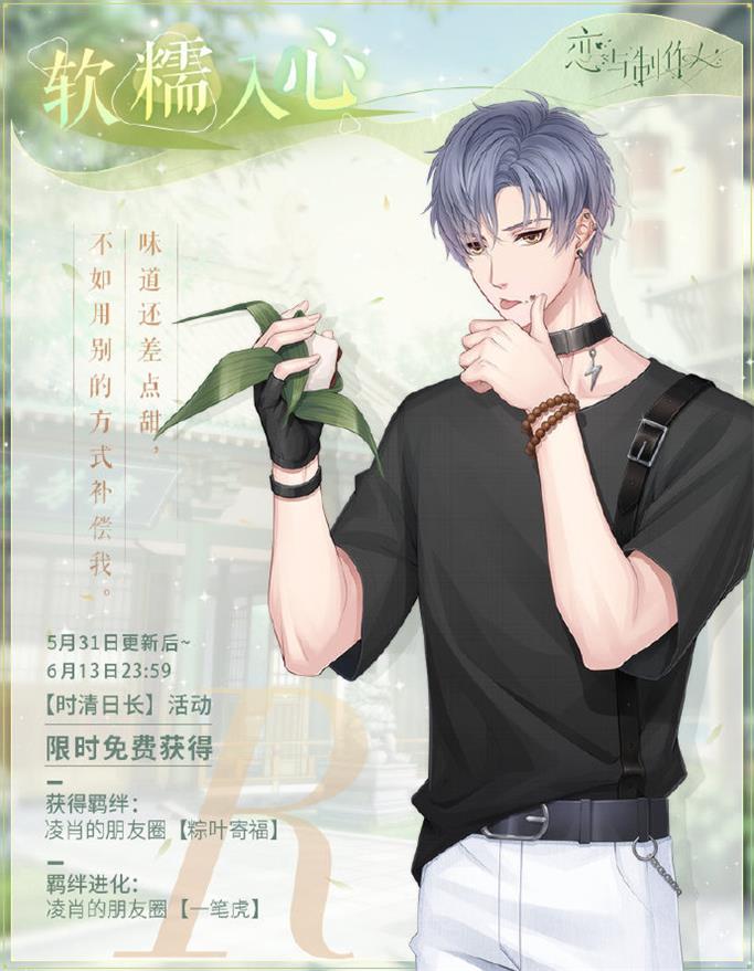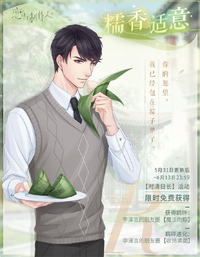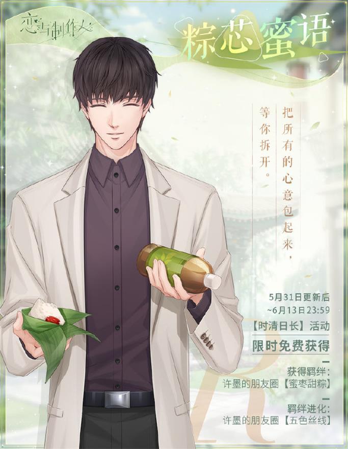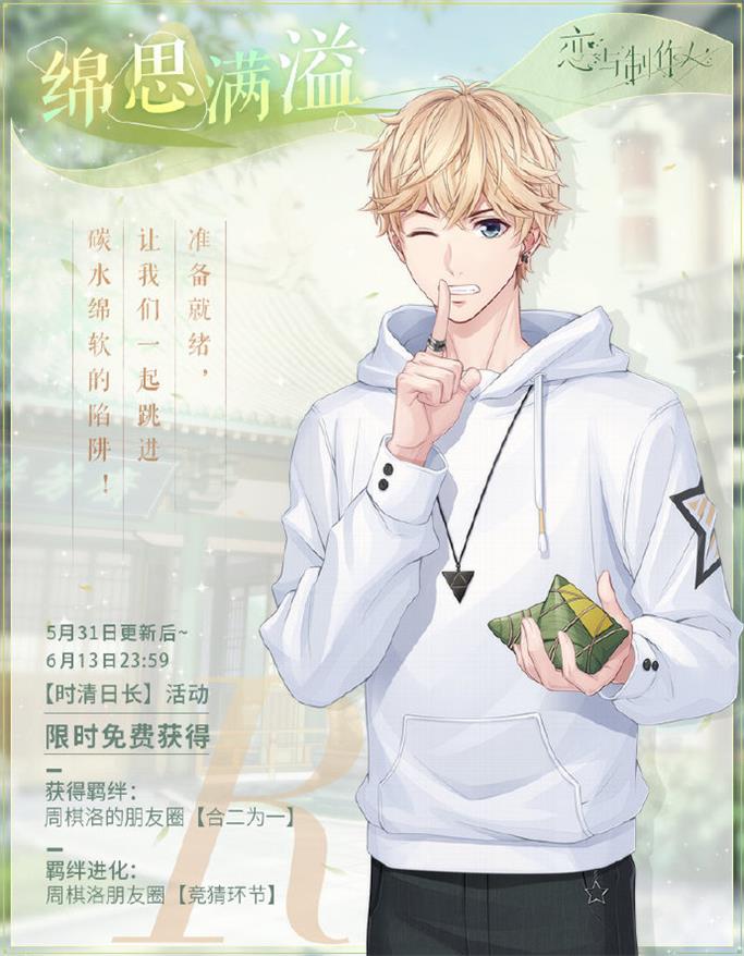5月31日更新后~6月13日,玩家可通过完成每日任务、主线&精英关卡拍摄等多种途径收集道具【菖蒲叶】,与他系菖蒲,必定会掉落【龙舟木雕】,还有几率随机获得端午节主题R羁绊、星河许愿券、曦光许愿券、体力等多重奖励。每系36次,必定可随机获得一张纪念R羁绊,且该方式获取的R羁绊不会重复。活动期间使用【龙舟木雕】,可在限时商店中兑换多种游戏奖励。龙舟泛波,蜜枣甜意,都是他想给你的端午记忆。